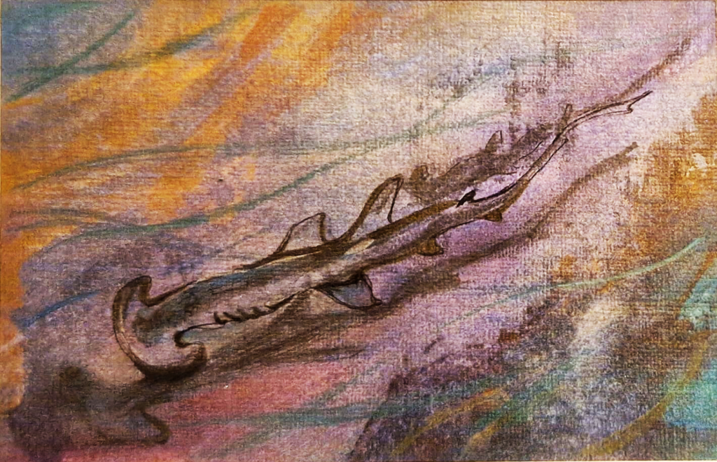 Hammerhai, 20×15, Acryl und Perlmuttstifte