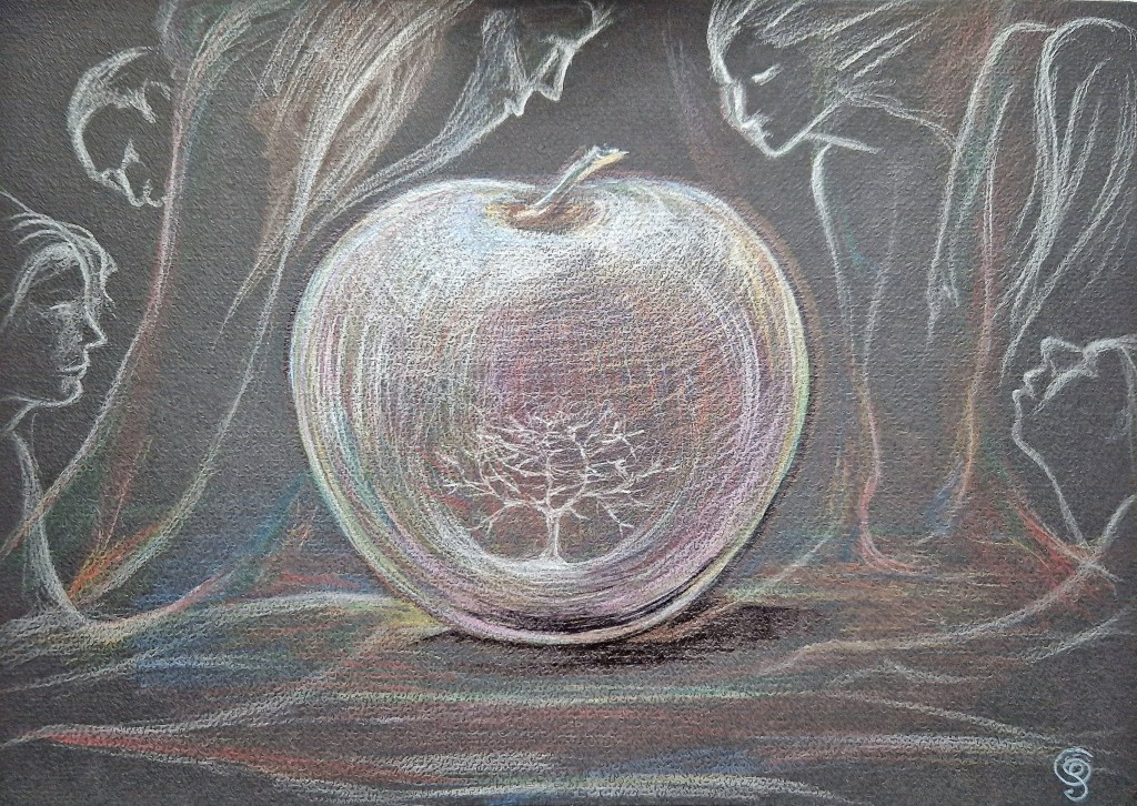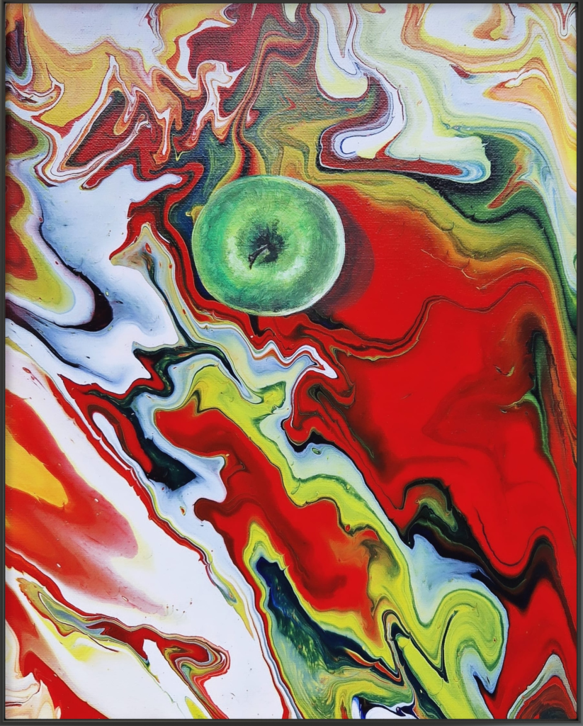 Apfel im Farbwirbel (2022), 30×40, Acrylfarben auf Leinwand