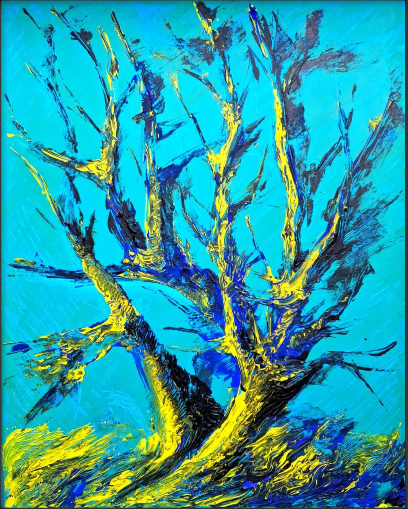 Vergabelung (2021), 40×50, Acrylfarben auf Leinwand mit Küchengabel