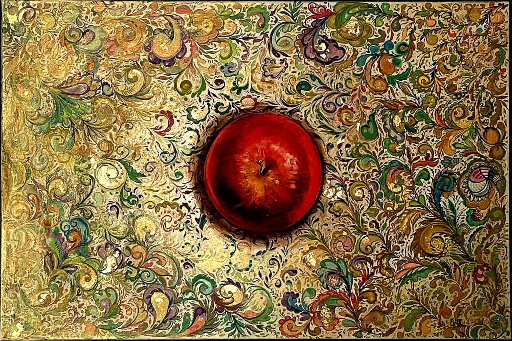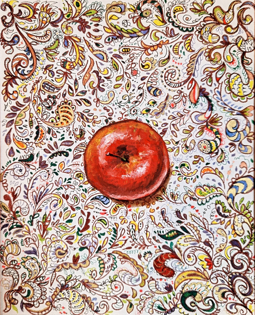 Apfel im Paisley (2022), 30×40, Acrylfarben- und Stifte auf Leinwand