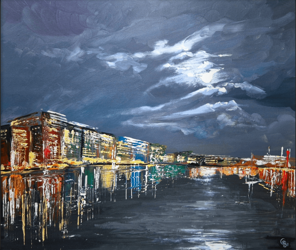 Die Spree im Mondschein (2023), 60×50, Acrylfarben auf Leinwand