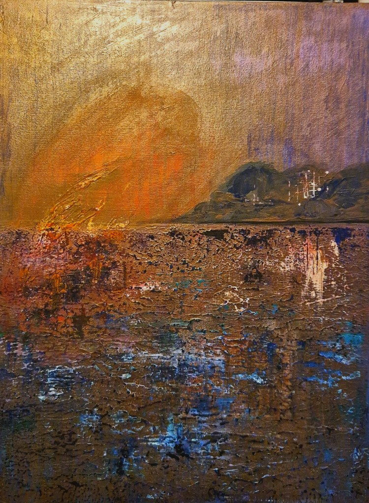 Feuer im Nebel auf der See (2024), 60×80, Acrylfarben auf Leiwand